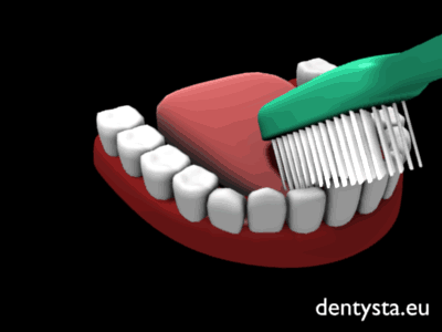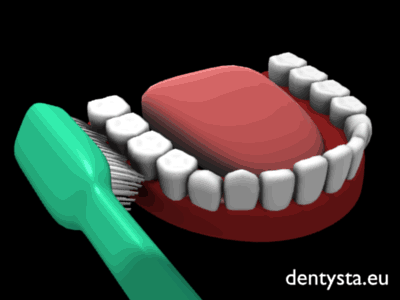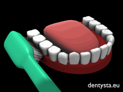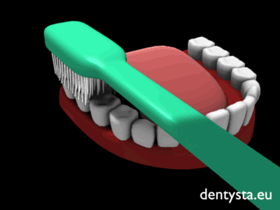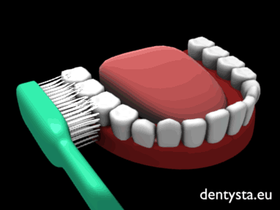 je na dziąśle. Przyciskając lekko szczotkę wywijamy ją w kierunku koron zębów,